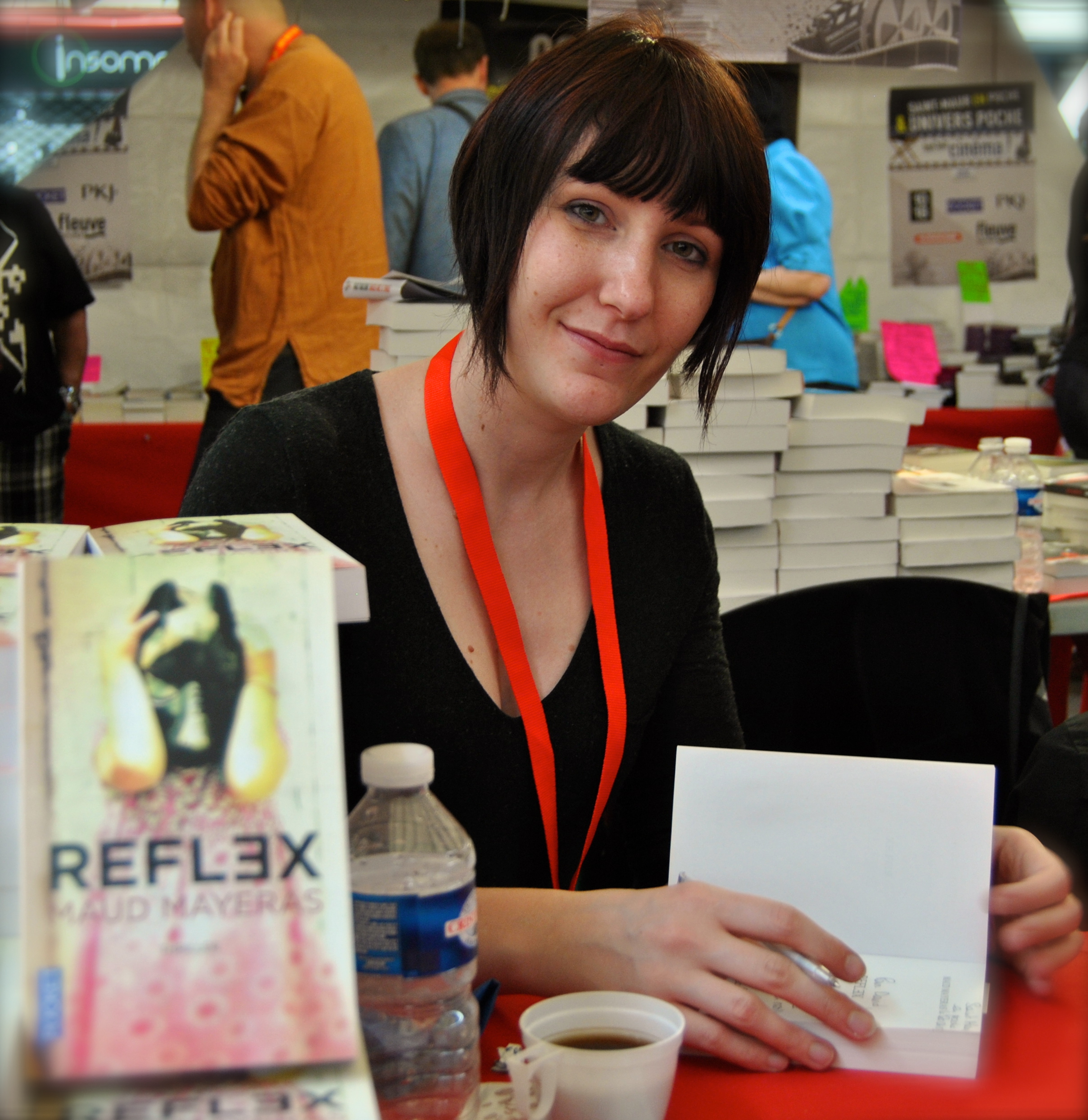 Et pour terminer en beauté cette journée, c’est avec une joie non dissimulée que je vais à la rencontre de la fameuse MAUD MAYERAS. Fameuse car depuis au moins un an, Yvan me menace des pires tortures si je ne lis par l’excellent « REFLEX » son coup de coeur 2014. Scarifié et le dos lardé de coups de fouet, je m’approche pour lui demander une dédicace. Je me sens tout timide devant elle. #YvanPression.